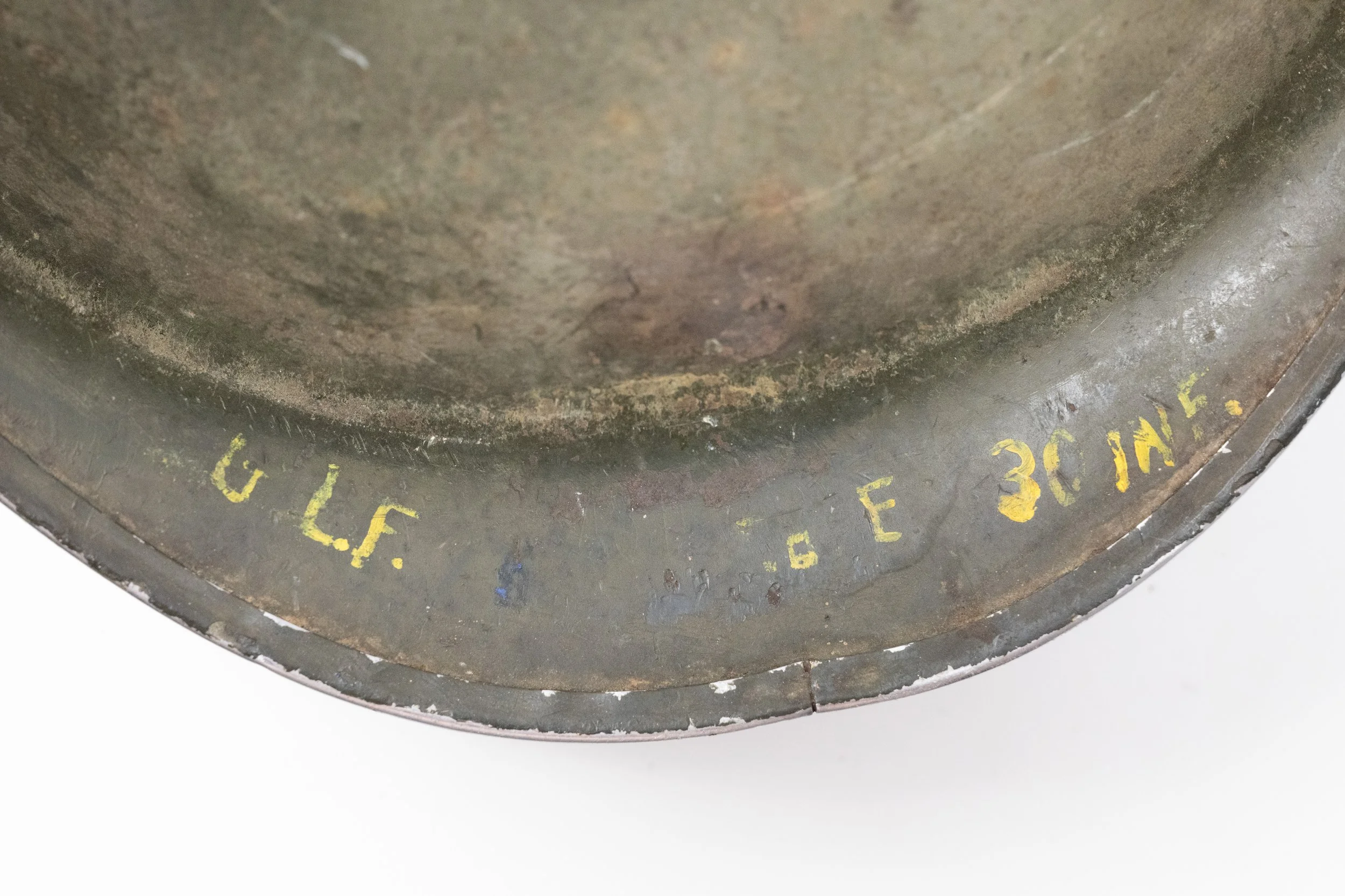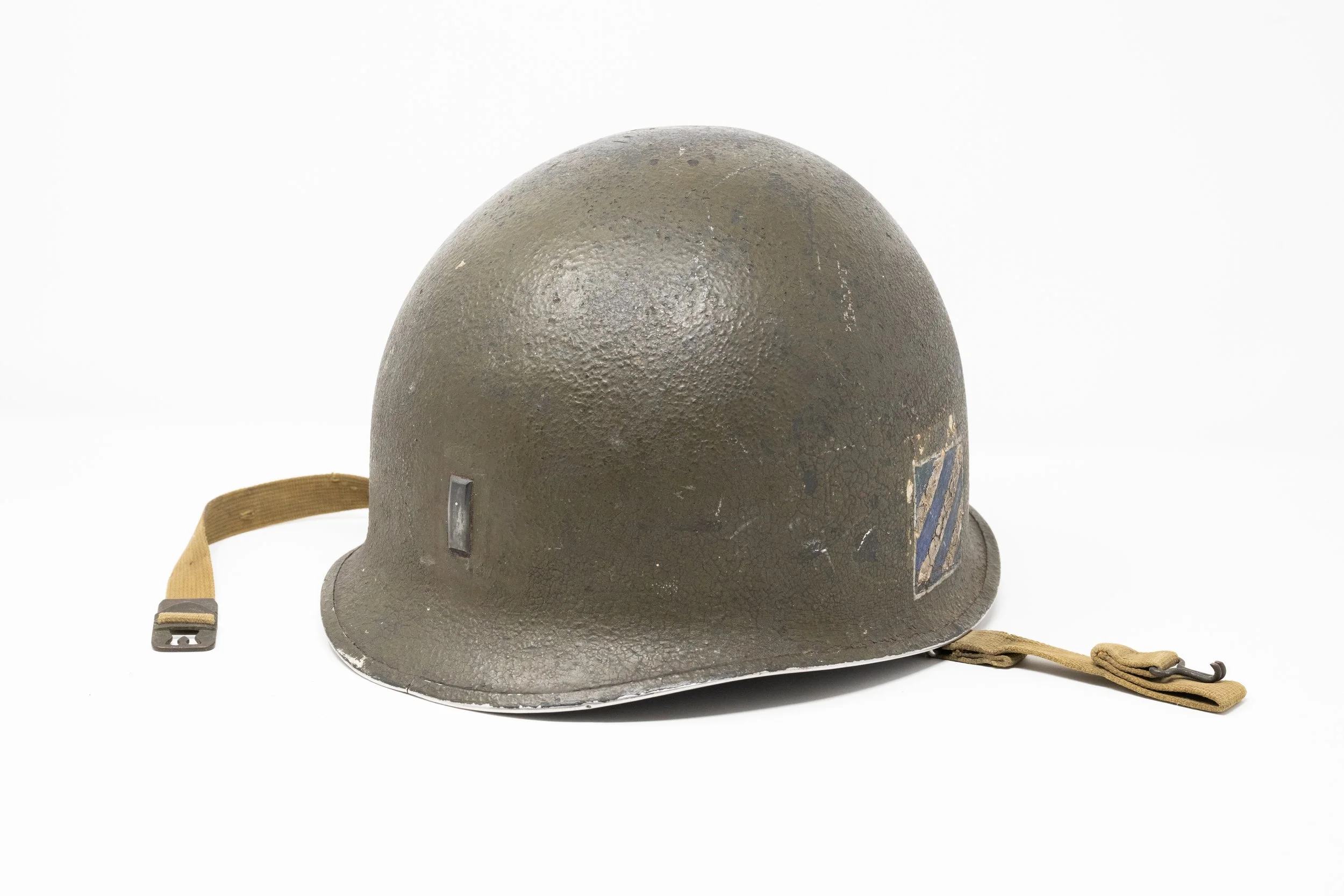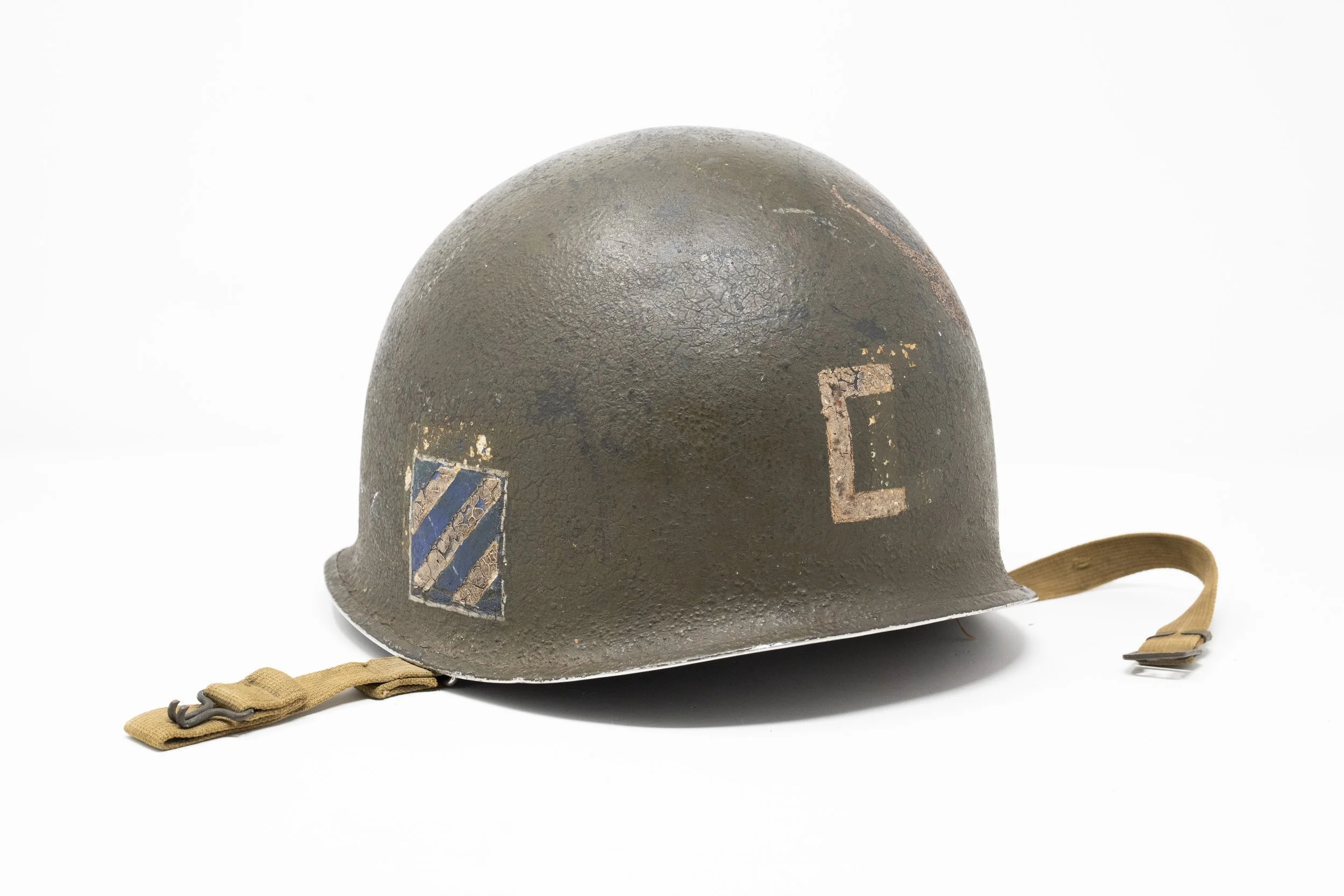 The WWII Veterans History Project recently acquired an original M1 helmet worn by Lambert P. Friederich, who served with E Company, 30th Infantry Regiment, 3rd Infantry Division. Carried through wartime service and preserved for more than eight decades, the helmet represents a rare surviving example of combat-used gear. We are deeply grateful to Kathy Godwin, Friederich’s daughter, for entrusting us with this historically significant artifact.
