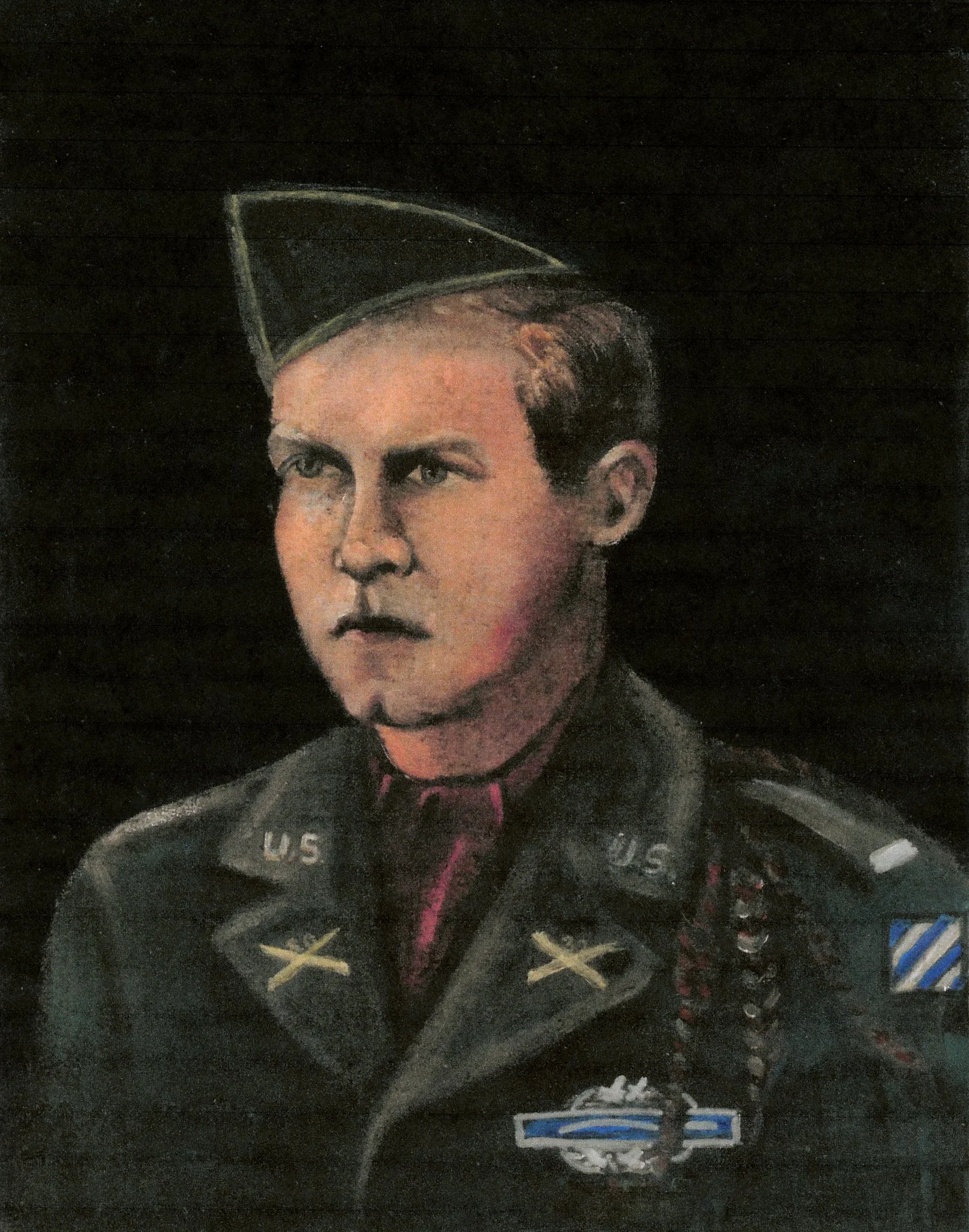 Painted by a liberated concentration camp inmate in 1945, this portrait depicts Lambert Friederich as a 1st Lieutenant in the 30th Infantry Regiment, 3rd Infantry Division.