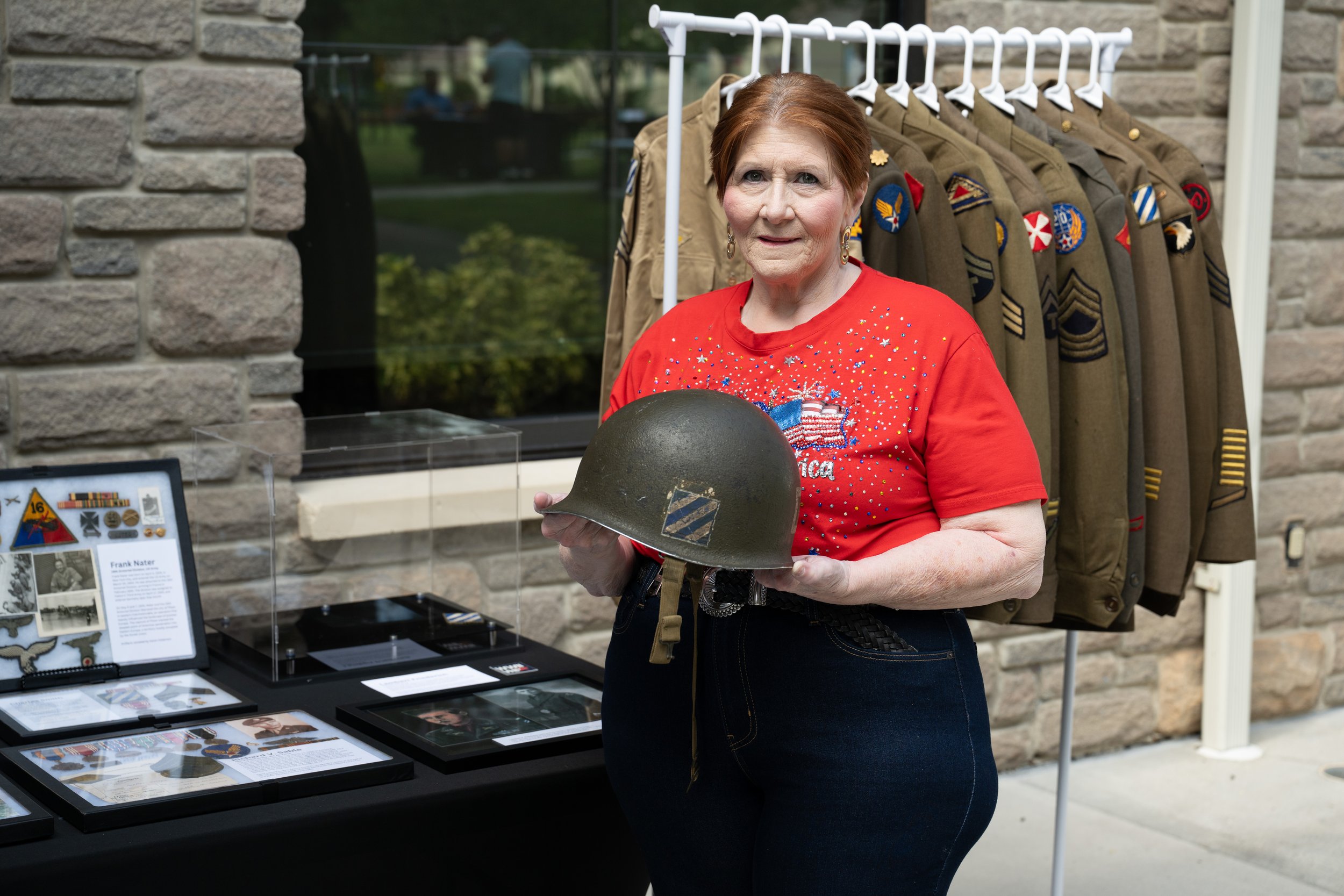 Kathy Godwin, Friederich’s daughter, holds her father’s M1 helmet, which she donated to the WWII Veterans History Project. The artifact is now part of our traveling museum exhibitions and permanent collection, helping to lay the groundwork for a future brick-and-mortar museum.